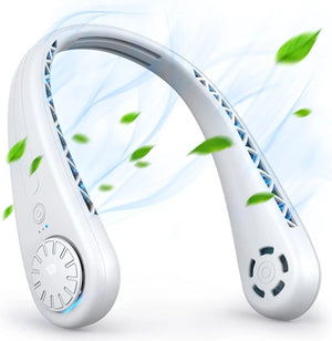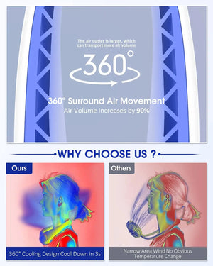 The latest neck fan in 2022, the design is inspired by headphones. It is both good-looking and cool. With thorough research on mechanics and wind direction, we design this irregular multi-outlet neck fan with dual vortex energy leafless movement and wind power. Stronger and quieter, it allows the head to enjoy a 360-degree surround-style cool breeze, quickly cooling down, and effectively solving the annoyance caused by sultry heat.
